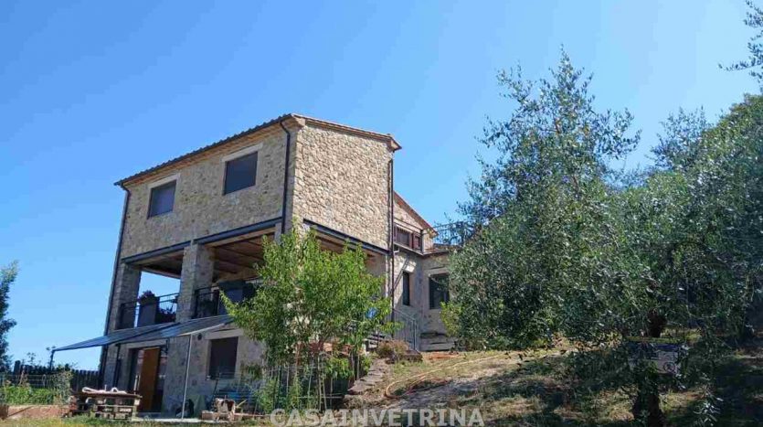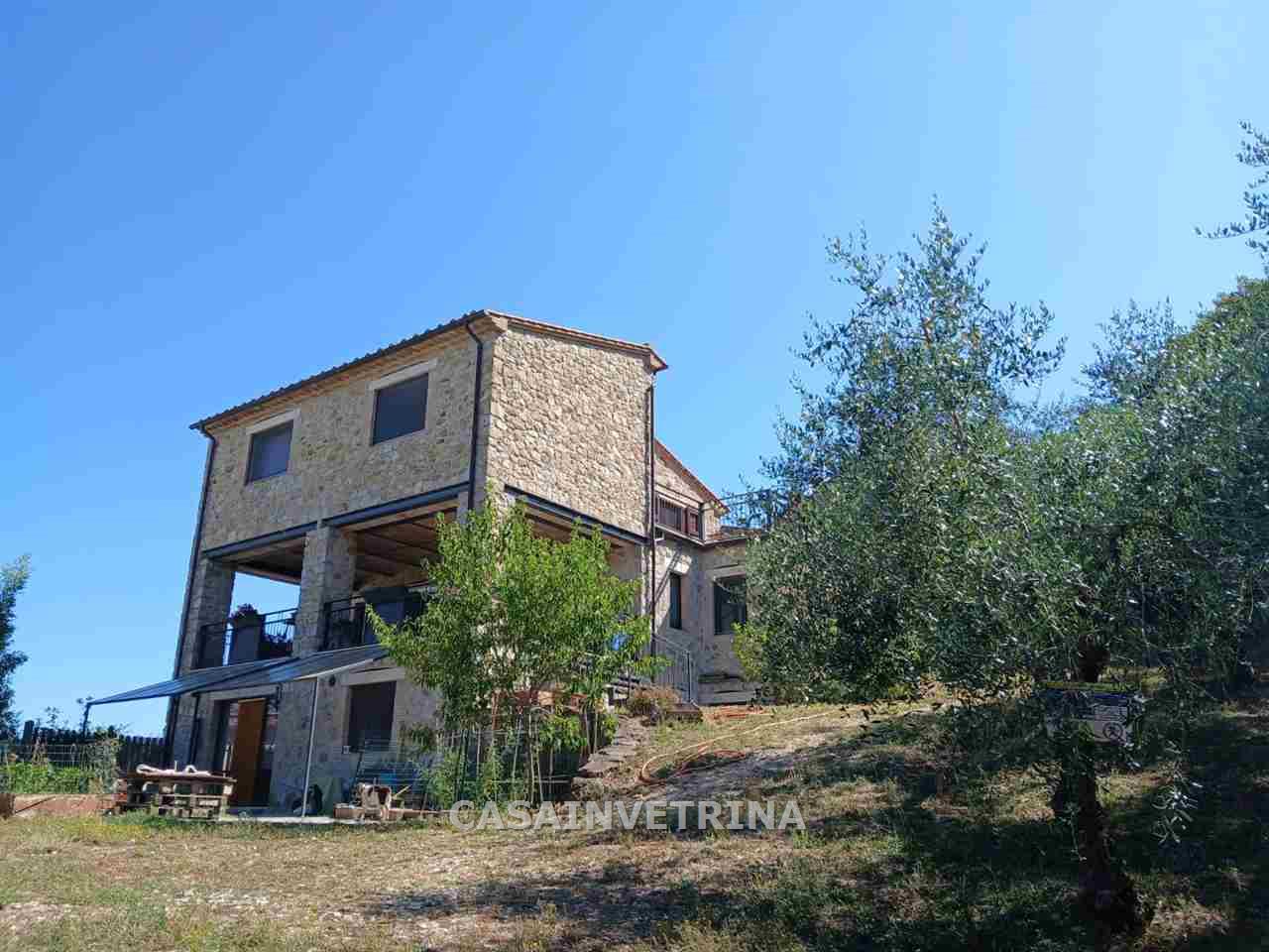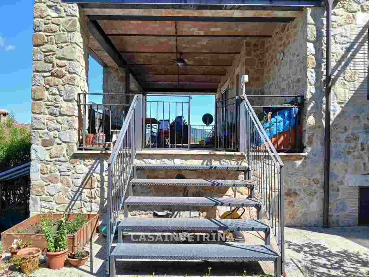 Proponiamo in vendita fabbricato monofamiliare completamente ristrutturato con muri esterni a pietra faccia vista. composto al, piano terra da ampio salone a vista sulla cucina abitabile,bagno con antibagno ampio portico coperto e panoramico. da scala interna con arrivo sul soppalco a vista con uscita in ampio terrazzo panoramico , due camere matrimoniali ognuna con bagno privato. al piano seminterrato collegato anche da scala interna ampia taverna divisa in tre locali, bagno, lavanderia il tutto comunicante con il garage. circonda il fabbricato terreno esclusivo di circa 1.000 mq. con varie piante da frutto e n°20 piante di ulivi. il fabbricato si trova in posizione dominante sulla frazione di poggio murella con vista panoramica, molto luminoso, ottimamente rifinito. centrale termica con impianto fotovoltaico RIF CVE217 Classe D Ep Gl 64,32. (rif. 18/3024.CVE217)